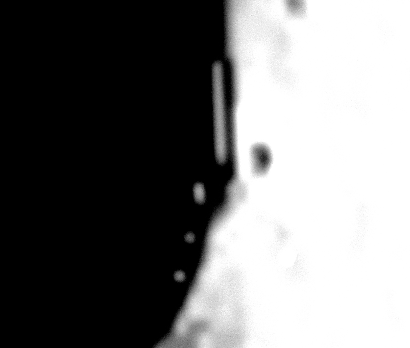 Wenn man solche Bilder vergrößert, kann man mit genügend Fantasie alles drin sehen. Ich habe mal eben einen völlig beliebigen Ausschnitt eines Mondbildes vergrößert und - siehe da! - man sieht dort ein "Triangel-Ufo", ganz so wie auf den eingefügten Referenzbildern von "Sichtungen".