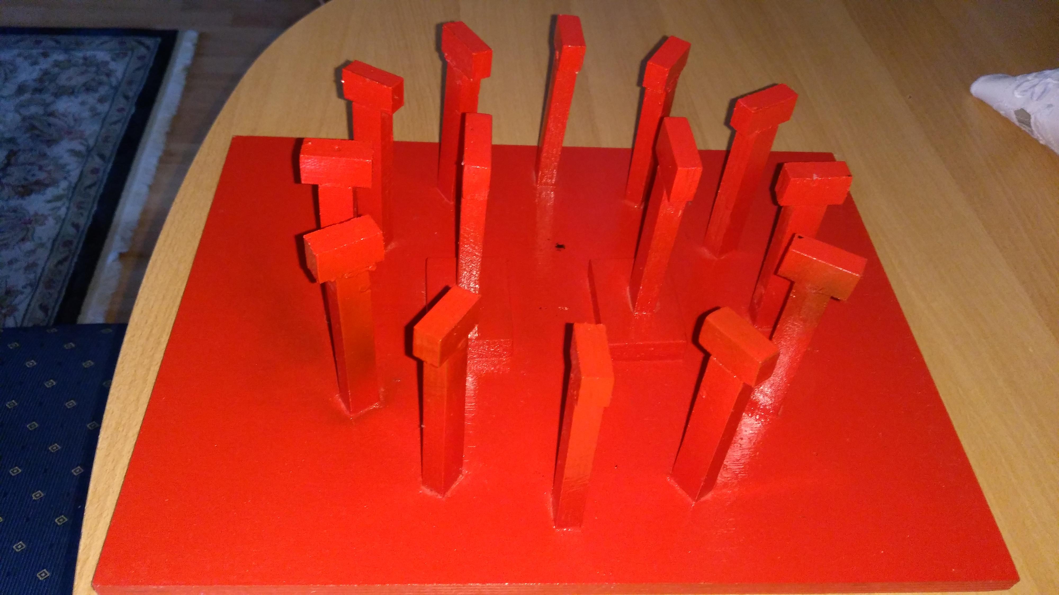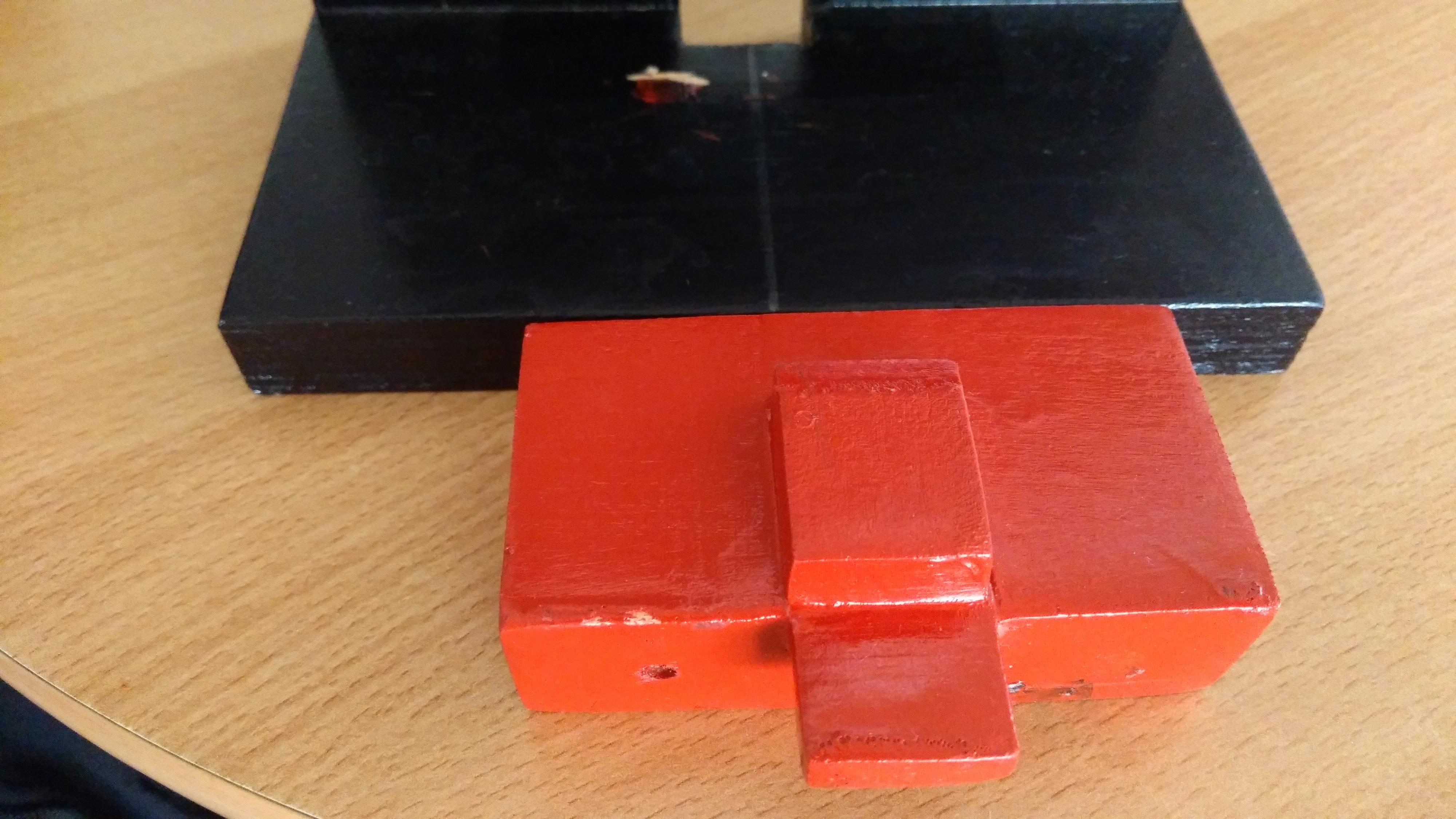 Es gibt vier Plattformen . Zwei kleinere zwei größere Plattformen,die jeweils mit einer Stange und einem viereckigen Rahmen versehen sind. Jeder Rahmen hat eine einzige Bohrung . Der Rahmen wird über den Vierkant des Zahnrads gesetzt und dass Zahnrad über die abgerundete frei bewegliche Achse gesetzt und zu dem zentralen Zahnrad perfekt ausgerichtet.